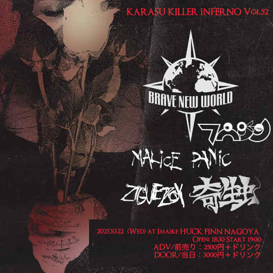 | 10/22(水) | [KARASU KILLER INFERNO Vol.52] BRAVE NEW WORLD (Australia) ZIGUEZOY 奇生虫 フウジン MALiCE PANiC 18:30 / 19:00 ¥2,500 / ¥3,000 (DRINK別) ■前売チケット 予約:メール 前日締切 公演日・お名前フルネーム・お電話番号 上記3点の明記をお願い致します。 |