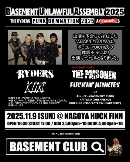 | 11/9(日) | [BASEMENT UNLAWFUL ASSEMBLY 2025 / PUNK DAMNATION 2025] THE RYDERS KiM FUCKIN' JUNKIES ハナフサリュウノスケ (THE NOiSE) THE PRISONER --DJ-- チャーマー (BASEMENT CLUB) APiTACO (ONEAPiENO) HIDEKING (FMC/AFTER9/HEARTSCRY) ※出演を予定しておりました"ANGER FLARES"は、 ボーカルYUICHI氏の体調不良により出演キャンセルとなりました。 ※出演を予定しておりました"THE NOiSE"は、 一部メンバーのバンド脱退により出演キャンセルとなりました。 代わりに"ハナフサリュウノスケ (THE NOiSE)"が ソロで出演いたします。 16:30 / 17:00 ¥3,500 / ¥4,000 (DRINK別) ※高校生以下の方は保護者同伴に限り入場無料 (身分証明書の提示を求める場合有り) ■前売チケット 予約:メール 前日締切 公演日・お名前フルネーム・お電話番号 上記3点の明記をお願い致します。 【TOTAL INFORMATION】 BASEMENT CLUB https://www.basementclub.com |