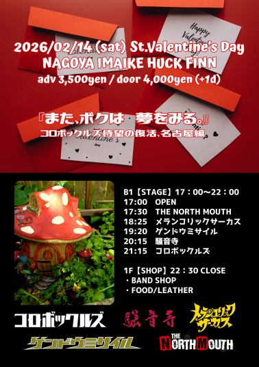 | 2/14(土) | [また、ボクは 夢をみる。] コロボックルズ (大阪) 騒音寺 (京都) ゲンドウミサイル (東京) メランコリックサーカス (名古屋) THE NORTH MOUTH (津) --DJ-- MORI-PUN MAI --出店-- On the night (LEATHER&HOT DRINK) 猫飯屋 (FOOD) 17:00 / 17:30 ¥3,500 / ¥4,000 (DRINK別) ■前売チケット 予約:メール 前日締切 公演日・お名前フルネーム・お電話番号 上記3点の明記をお願い致します。 |