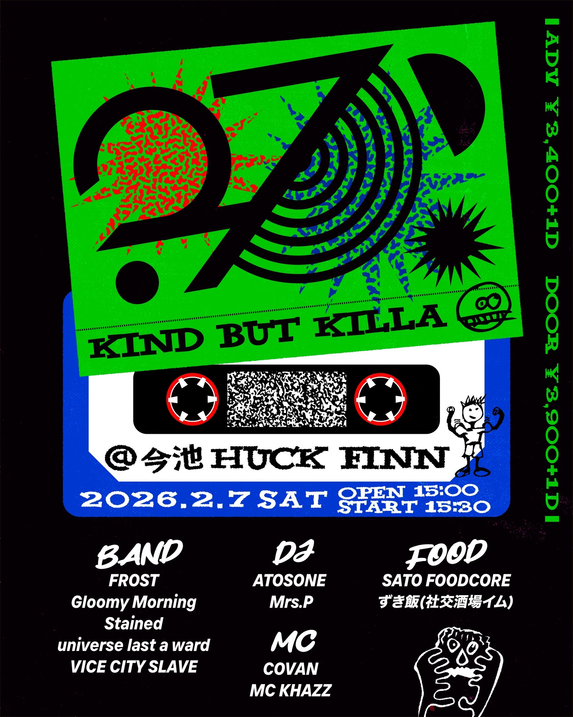 ![]() 2/7(SAT) [KIND BUT KILLA] --BAND-- FROST Gloomy Morning Stained universe last a ward VICE CITY SLAVE --DJ-- ATOSONE Mrs.P --MC-- COVAN MC KHAZZ --FOOD-- SATO FOODCORE ずき飯 (社交酒場イム) |