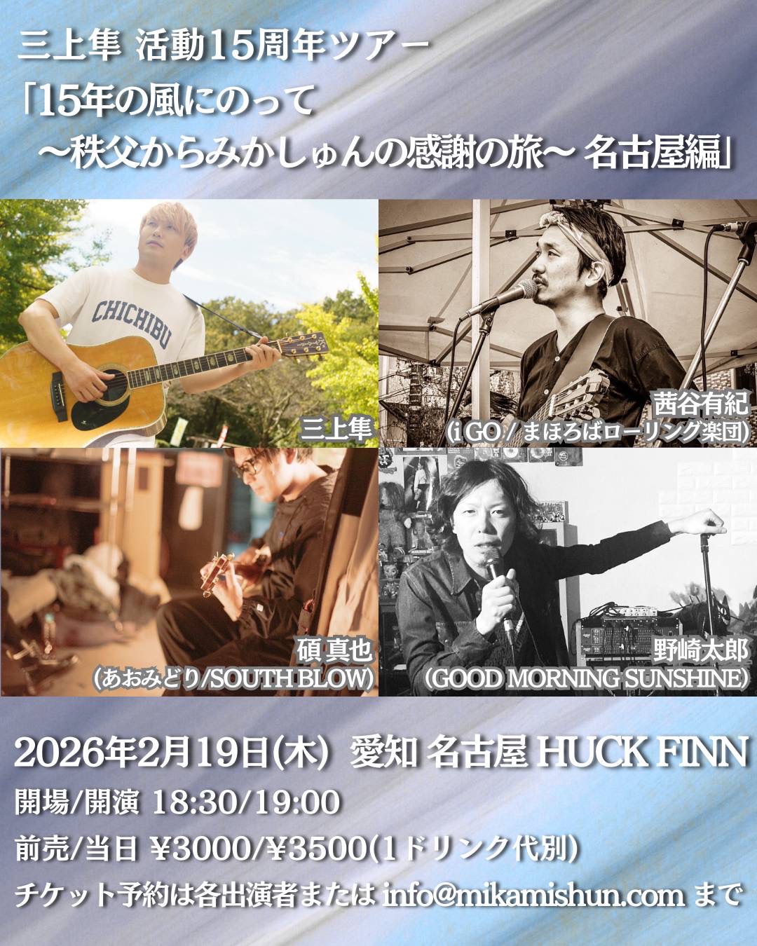 ![]() 2/19(THU) [三上隼 活動15周年ツアー] -15年の風にのって秩父からみかしゅんの感謝の旅 名古屋編- 三上隼 碩 真也 (あおみどり / SOUTH BLOW) 茜谷有紀 (i GO / まほろばローリング楽団) 野崎太郎 (GOOD MORNING SUNSHINE) |