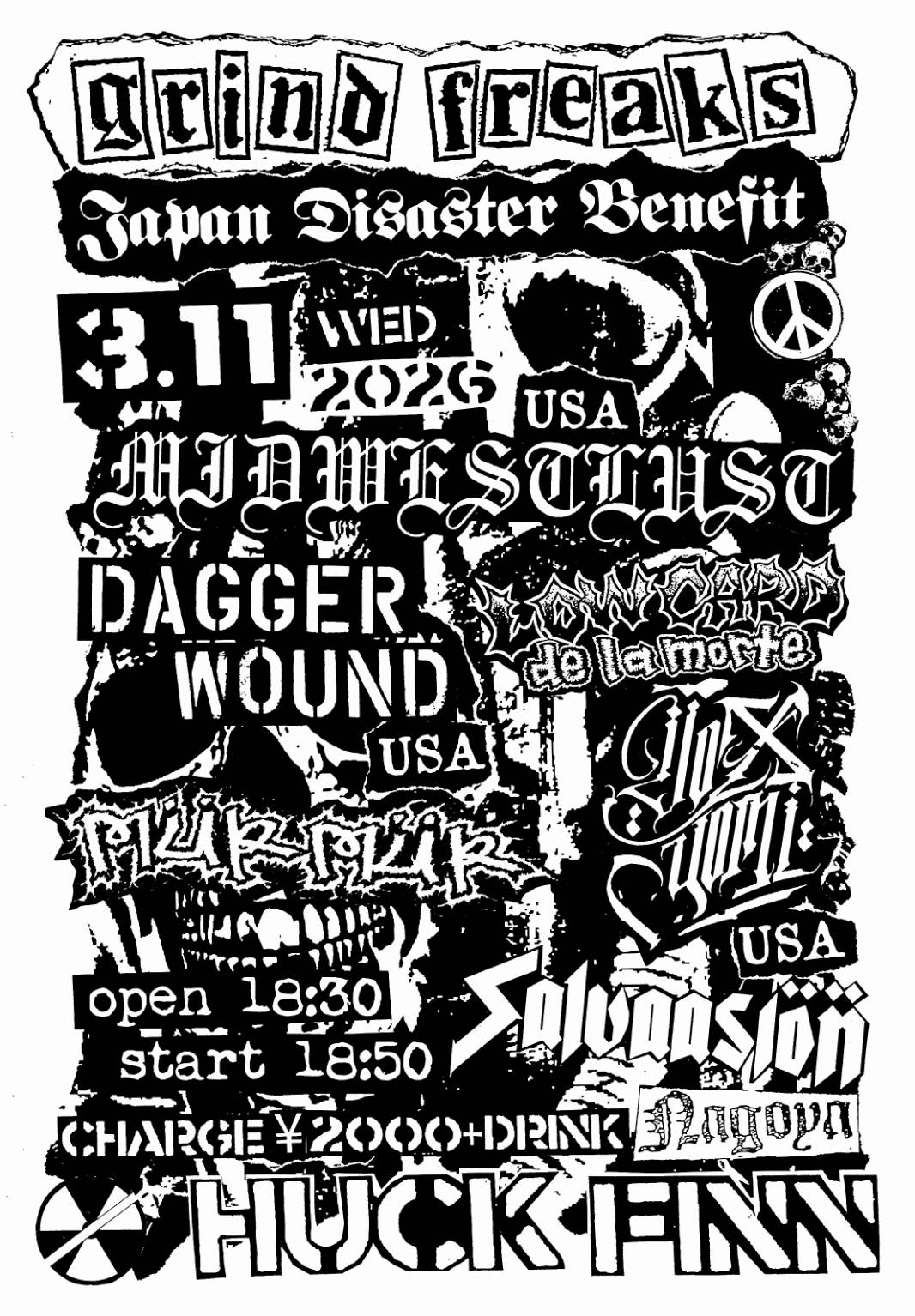 ![]() 3/11(WED) [GRIND FREAKS] -Japan Disaster Benefit- Midwestlust (USA) Dagger Wound (USA) Vox Yomi (USA) murmur Low Card de la morte Salvaasion |