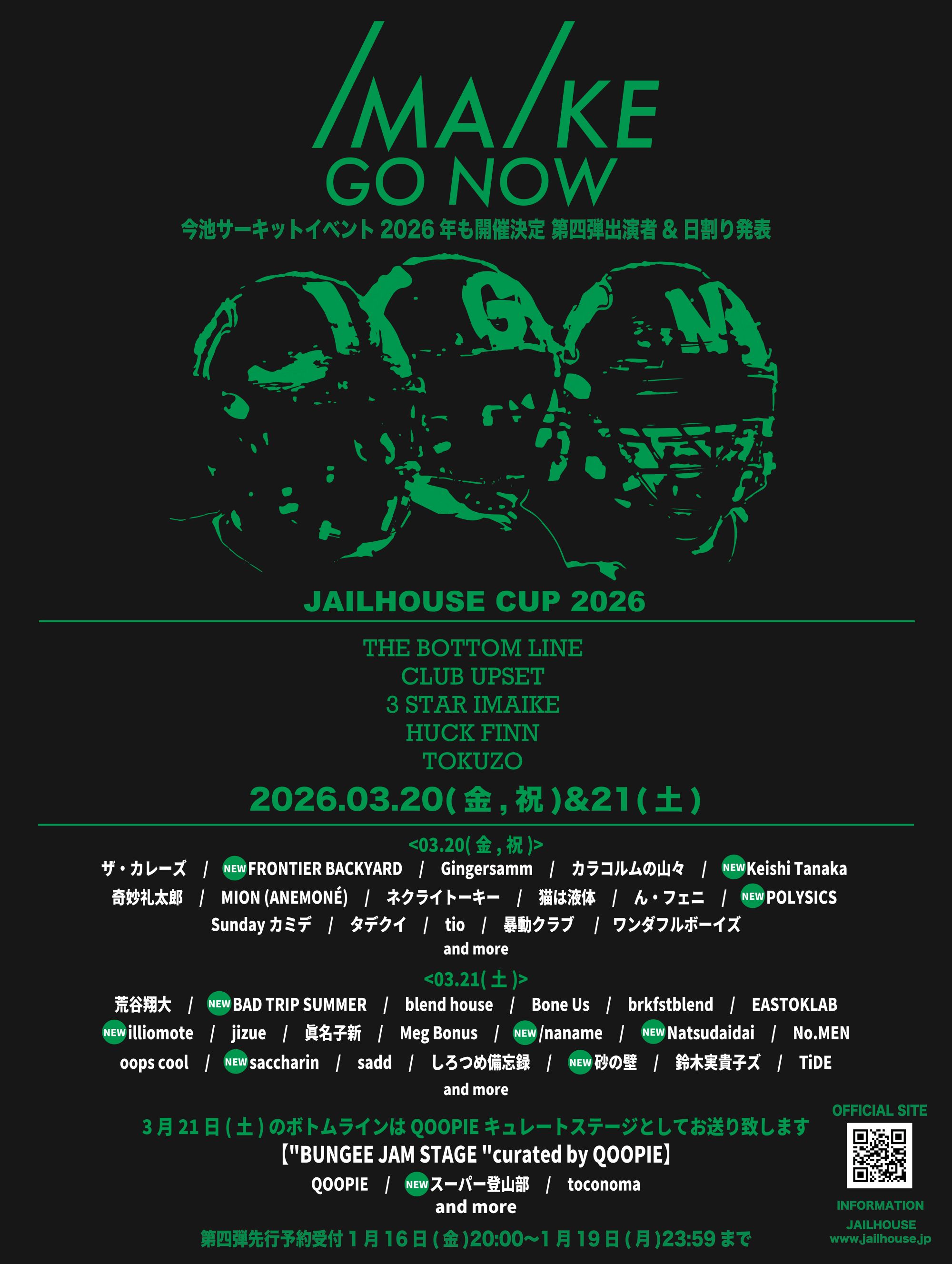 ![]() [IMAIKE GO NOW 2026] 第四弾出演者10組 & 出演日割り発表 第四弾先行予約受付 3/20(FRI) ザ・カレーズ / FRONTIER BACKYARD【NEW】/ Gingersamm / カラコルムの山々 / Keishi Tanaka【NEW】/ 奇妙礼太郎 / MION (ANEMONÉ) / ネクライトーキー / 猫は液体 / ん・フェニ / POLYSICS【NEW】/ Sundayカミデ / タデクイ / tio / 暴動クラブ / ワンダフルボーイズ and more ----------------------------------------------------------------------- 3/21(SAT) 荒谷翔大 / BAD TRIP SUMMER【NEW】/ blend house / Bone Us / brkfstblend / EASTOKLAB / illiomote【NEW】/ jizue / 眞名子新/ Meg Bonus / /naname【NEW】/ Natsudaidai【NEW】/ No.MEN / oops cool / saccharin【NEW】/ sadd / しろつめ備忘録 / 砂の壁【NEW】/ 鈴木実貴子ズ / TiDE and more ["BUNGEE JAM STAGE" curated by QOOPIE] at:THE BOTTOM LINE QOOPIE / スーパー登山部【NEW】/ toconoma / and more |