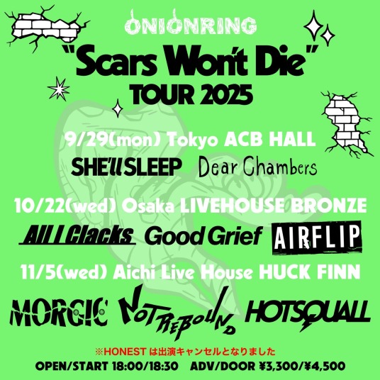 | 11/5(水) | [ONIONRING Limited Single "Scars Won't Die" TOUR 2025] ONIONRING HOTSQUALL NOT REBOUND MORGIC HONESTは出演キャンセルとなりました。ご了承下さい。 18:00 / 18:30 ¥3,300 / ¥4,500 (DRINK別) |