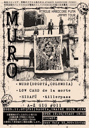 | 11/7(金) | [A-Z GIG #011] -ATAQUE HARDCORE PUNK JAPAN TOUR 2025- MURO (Bogotá,Colombia) LOW CARD de la morte SIBAFÜ Killerpass 19:00 / 19:30 ¥2,900 (DRINK別) 25歳未満 ¥1,400 (DRINK別) 20歳未満 FREE (DRINK別) ※受付にて身分証のご提示お願いします |