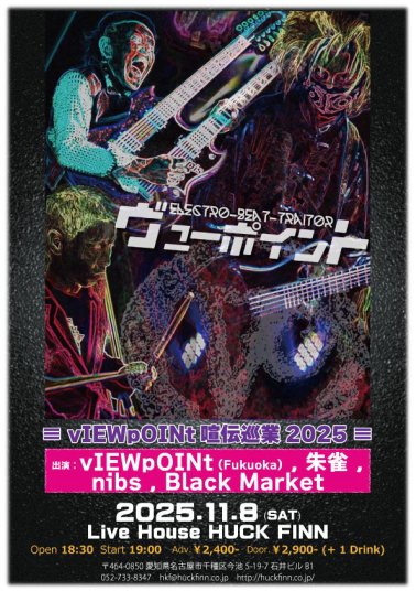 | 11/8(土) | [vIEWpOINt 喧伝巡業2025] vIEWpOINt (福岡) 朱雀 nibs Black Market 18:30 / 19:00 ¥2,400 / ¥2,900 (DRINK別) ■前売チケット 予約:メール 前日締切 公演日・お名前フルネーム・お電話番号 上記3点の明記をお願い致します。 |