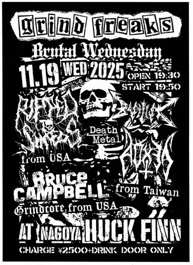 | 11/19(水) | [GRIND FREAKS] -Brutal Wednesday- Ripped to Shreds (USA) Aohen (Taiwan) Bruce Campbell (USA) Basilisk 19:30 / 19:50 ¥2,500 (DRINK別) |