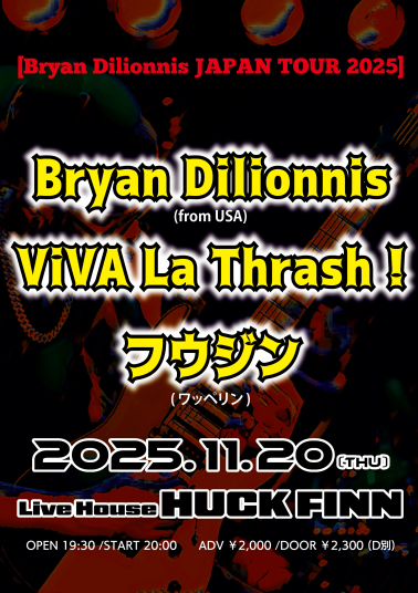 | 11/20(木) | [Bryan Dilionnis JAPAN TOUR 2025] Bryan Dilionnis (from USA) ViVA La Thrash ! フウジン [ワッペリン] 19:30 / 20:00 ¥2,000 / ¥2,300 (DRINK別) ■前売チケット 予約:メール 前日締切 公演日・お名前フルネーム・お電話番号 上記3点の明記をお願い致します。 |