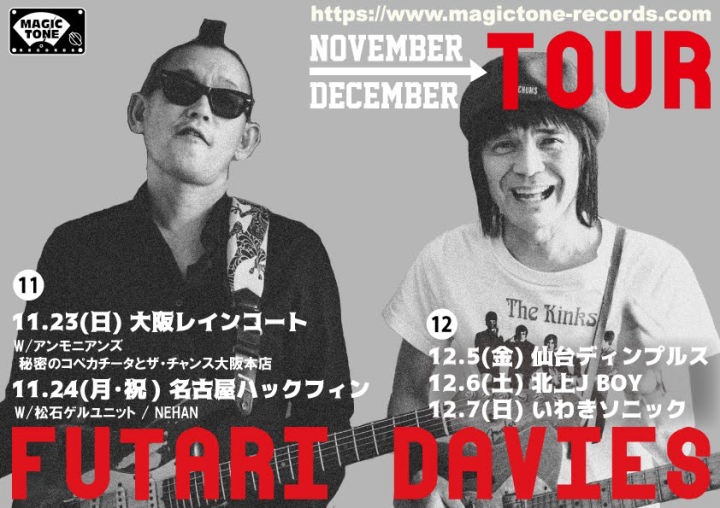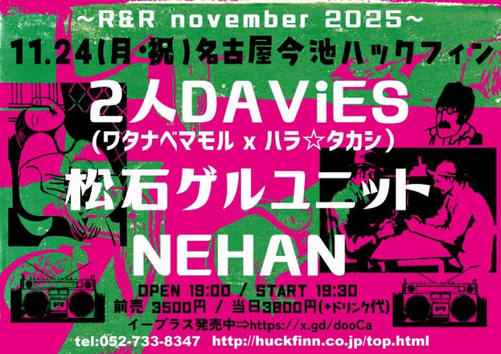 | 11/24(月) | [R&R november 2025] 2人DAViES (ワタナベマモル・ハラ☆タカシ) 松石ゲルユニット NEHAN 18:30 / 19:00 ¥3,500 / ¥3,800 (DRINK別) ■前売チケット 予約:メール 前日締切 公演日・お名前フルネーム・お電話番号 上記3点の明記をお願い致します。 |