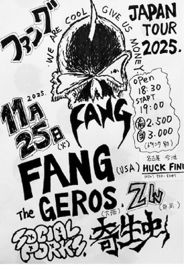 | 11/25(火) | [FANG JAPAN TOUR 2025] FANG (USA) theGEROS (大阪) Zん (静岡) 奇生虫 SOCIAL PORKS 18:30 / 19:00 ¥2,400 / ¥2,900 (DRINK別) ■前売チケット 予約:メール 前日締切 公演日・お名前フルネーム・お電話番号 上記3点の明記をお願い致します。 |