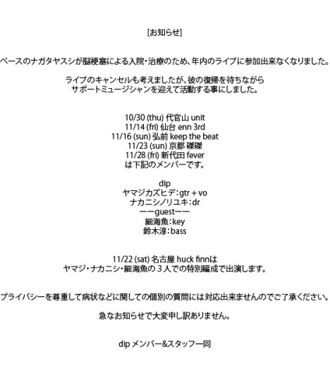 | 11/22(土) | [LABO 34] dip Guest:細海魚 (Key) 18:00 / 18:30 ¥5,000 / ¥5,500 (DRINK別) |