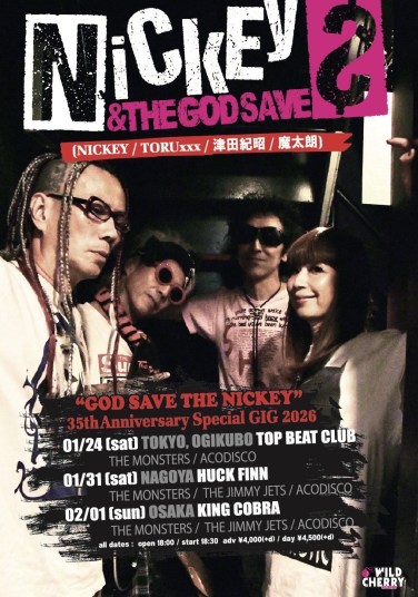 | 1/31(土) | [GOD SAVE THE NICKEY] -35th Anniversary Special GIG 2026- Nickey & The God Saves [Nickey / TORUxxx / 津田紀昭 / 魔太朗] THE MONSTERS THE JIMMY JETS ACODISCO 18:00 / 18:30 ¥4,000 / ¥4,500 (DRINK別) ■前売チケット 予約:メール 前日締切 公演日・お名前フルネーム・お電話番号 上記3点の明記をお願い致します。 |