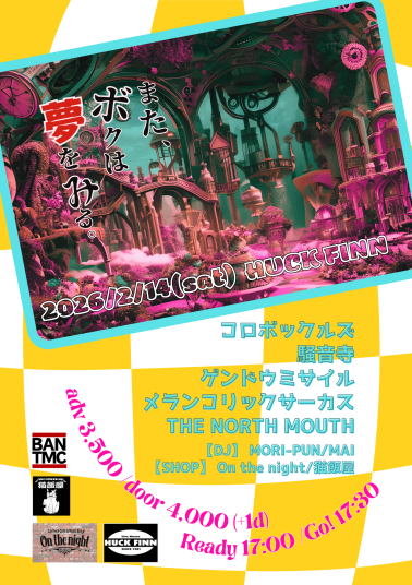 | 2/14(土) | [また、ボクは 夢をみる。] コロボックルズ (大阪) 騒音寺 (京都) ゲンドウミサイル (東京) メランコリックサーカス (名古屋) THE NORTH MOUTH (津) --DJ-- MORI-PUN MAI --出店-- On the night (LEATHER&HOT DRINK) 猫飯屋 (FOOD) 17:00 / 17:30 ¥3,500 / ¥4,000 (DRINK別) ■前売チケット 予約:メール 前日締切 公演日・お名前フルネーム・お電話番号 上記3点の明記をお願い致します。 |