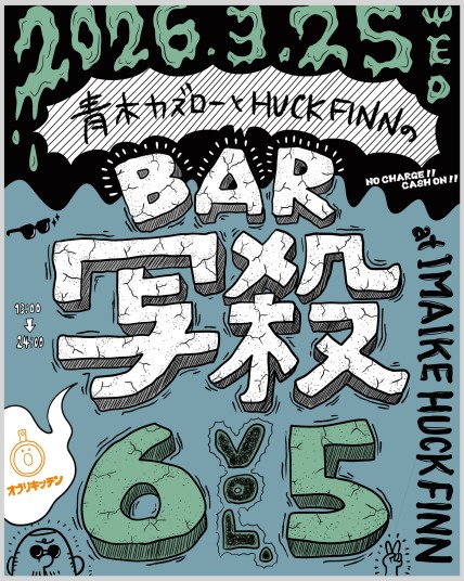 | 3/25(水) | [bar 写殺 Vol.65] at: HUCK FINN FACTORY (1F) マスター:青木カズロー 出店:オブリキッチン マスターセレクトのお酒や手作りおつまみ有ります。 オブリキッチンのおいしいご飯もおたのしみに。 OPEN 13:00 CLOSE 24:00 (Last order 23:30) NO CHARGE |