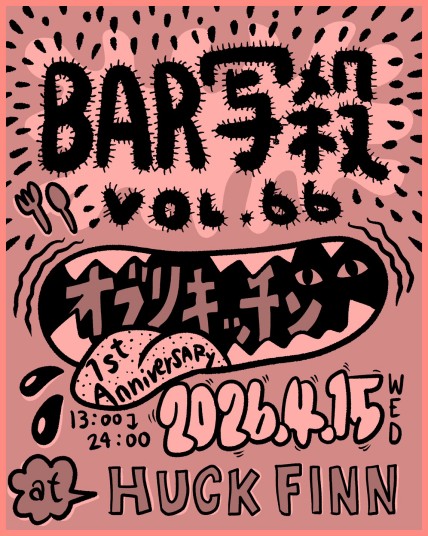 | 4/15(水) | [bar 写殺 Vol.66] at: HUCK FINN FACTORY (1F) マスター:青木カズロー 出店:オブリキッチン マスターセレクトのお酒や手作りおつまみ有ります。 オブリキッチンのおいしいご飯もおたのしみに。 OPEN 13:00 CLOSE 24:00 (Last order 23:30) NO CHARGE |