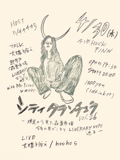 | 4/30(木) | [シティ・タランチュラ vol.26] -横道から見た森道市場 今年の見どころとLIVERARYエリアに迫る- LIVE 大橋裕之 hoohos TALK 大橋裕之 武部 (森道市場LIVERARYエリア担当) with Mr. Friend & more HOST ツチヤチカら 19:30 / 20:00 当日券のみ ¥1,000 (1DRINK付) |
