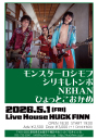| 5/1(金) | モンスターロシモフ シリキレトンボ NEHAN ひょっとこおかめ 18:30 / 19:00 ¥2,500 / ¥3,000 (DRINK別) ■前売チケット 予約:メール 前日締切 公演日・お名前フルネーム・お電話番号 上記3点の明記をお願い致します。 |