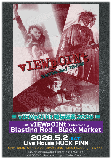 | 5/2(土) | [vIEWpOINt 喧伝巡業 2026] vIEWpOINt Blasting Rod Black Market 18:30 / 19:00 ¥2,500 / ¥3,000 (DRINK別) ■前売チケット 予約:メール 前日締切 公演日・お名前フルネーム・お電話番号 上記3点の明記をお願い致します。 |