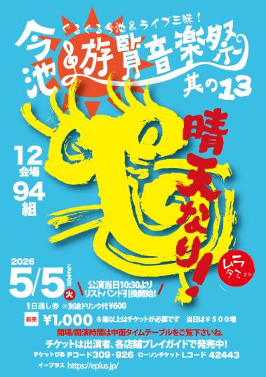 | 5/5(火) | [今池"遊覧"音楽祭 其の13] 会場 ボトムライン / Tokuzo / CLUB UPSET / HUCK FINN / open house / つるのり / あらたると / 3STAR IMAIKE / valentine drive / Paradise Cafe21 / IMAIKE GROW / ストリートコーナーパラダイスStage 11:30 / 12:00 ¥1,000 / ¥1,500 (DRINK別) ※6歳以上有料 (未就学児は保護者同伴で無料) 前売チケットは各会場でも販売しております。 タイムテーブル・出演者情報は公式サイトをご確認下さい。 公式サイトはこちら |