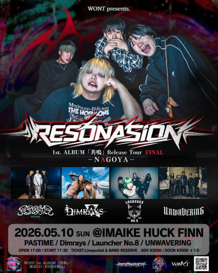 | 5/10(日) | [WONT 1st Album 『共鳴』Release Tour FINAL] -"RESONATION" 名古屋編 - WONT (三重) Launcher No.8 (大阪) Dimrays (大阪) UNWAVERING (愛知) PASTIME (愛知) 17:00 / 17:30 ¥3,000 / ¥3,500 (DRINK別) |