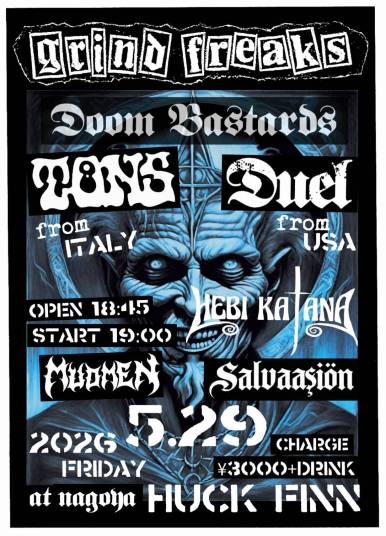 | 5/29(金) | [GRIND FREAKS] -Doom Bastards- Tons (ITALY) Duel (USA) Hebikatana (TOKYO) Mudmen Salvaasion 18:45 / 19:00 ¥3,000 (DRINK別) |