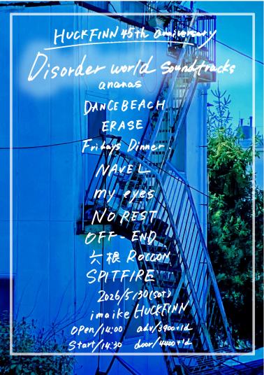| 5/30(土) | =HUCK FINN 45th ANNIVERSARY= [Disorder world soundtracks] ananas DANCEBEACH Fridays Dinner my eyes Navel NO REST OFF-END 六根 ROCCON SPITFIRE erase (member:OUT OF TOUCH, Feeler, DANCEBEACH) 14:00 / 14:30 ¥3,900 / ¥4,400 (DRINK別) ■前売チケット 予約:メール 前日締切 公演日・お名前フルネーム・お電話番号 上記3点の明記をお願い致します。 |