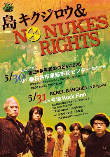 | 5/31(日) | [REBEL BANQUET in Nagoya] 島キクジロウ&NO NUKES RIGHTS ぷちダイハチ うな武 DJ WHISKY (Japonicus West) 17:30 / 18:00 ¥3,500 / ¥4,000 (DRINK別) ■前売チケット 予約:メール 前日締切 公演日・お名前フルネーム・お電話番号 上記3点の明記をお願い致します。 |