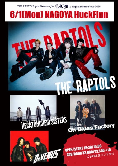 | 6/1(月) | [THE RAPTOLS new single 「Laugh」release tour 2026] THE RAPTOLS Hecatoncheir sisters Dr.VENUS Oh Blues Factory 18:30 / 19:00 ¥3,000 / ¥3,500 (DRINK別) ■前売チケット 予約:メール 前日締切 公演日・お名前フルネーム・お電話番号 上記3点の明記をお願い致します。 |
