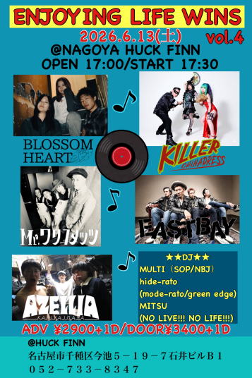 | 6/13(土) | [ENJOYING LIFE WINS vol.4] BLOSSOM HEART EASTBAY KILLER CHINADRESS Mr.ワリコメッツ AZELLIA --DJ-- MULTI (SOP / NBJ) hide-rato (mode-rato / green edge) MITSU (NO LIVE!!! NO LIFE!!!) 17:00 / 17:30 ¥2,900 / ¥3,400 (DRINK別) |