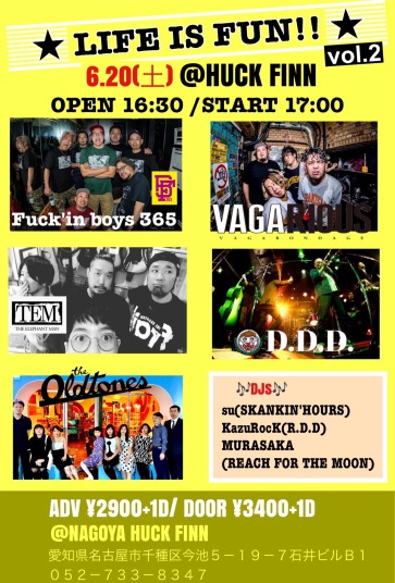 | 6/20(土) | [LIFE IS FUN‼︎vol.2] THE OLDTONES D.D.D. THE ELEPHANT MAN Fuck'in boys 365 vagarious vagabondage --DJ-- MURASAKA (REACH FOR THE MOON) su (SKANKIN'HOURS) KazuRocK (R.D.D) 16:30 / 17:00 ¥2,900 / ¥3,400 (DRINK別) ■前売チケット 予約:メール 前日締切 公演日・お名前フルネーム・お電話番号 上記3点の明記をお願い致します。 |