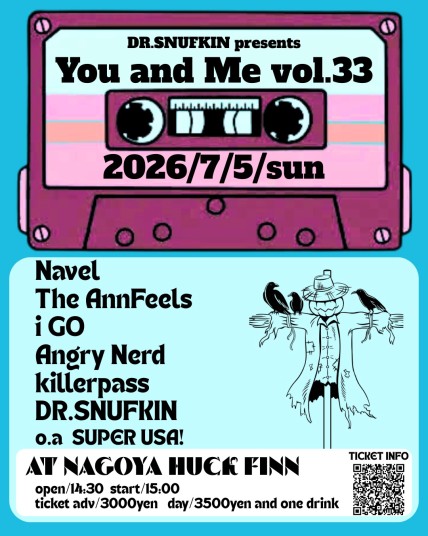 | 7/5(日) | [You and Me vol.33] NAVEL The Ann Feels i GO ANGRY NERD Killerpass DR.SNUFKIN opening act:SUPER USA! 14:30 / 15:00 ¥3,000 / ¥3,500 (DRINK別) ■前売チケット 予約:メール 前日締切 公演日・お名前フルネーム・お電話番号 上記3点の明記をお願い致します。 |