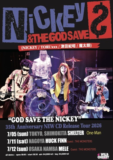 | 7/11(土) | ["GOD SAVE THE NICKEY 35th Anniversary” NEW CD Release Tour 2026] NICKEY & THE GOD SAVES [NICKEY / TORUxxx / 津田紀昭 / 魔太朗] guest:THE MONSTERS 18:00 / 18:30 ¥4,000 / ¥4,500 (DRINK別) ■前売チケット 予約:メール 前日締切 公演日・お名前フルネーム・お電話番号 上記3点の明記をお願い致します。 |