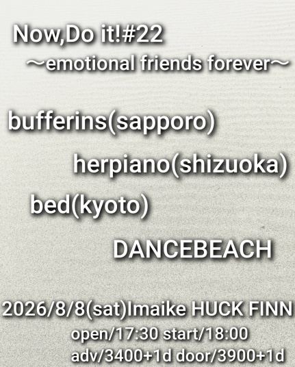 | 8/8(土) | [Now,Do it! #22] -emotional friends forever- bufferins (札幌) herpiano (静岡) bed (京都) DANCEBEACH 17:30 / 18:00 ¥3,400 / ¥3,900 (DRINK別) ■前売チケット 予約:メール 前日締切 公演日・お名前フルネーム・お電話番号 上記3点の明記をお願い致します。 |