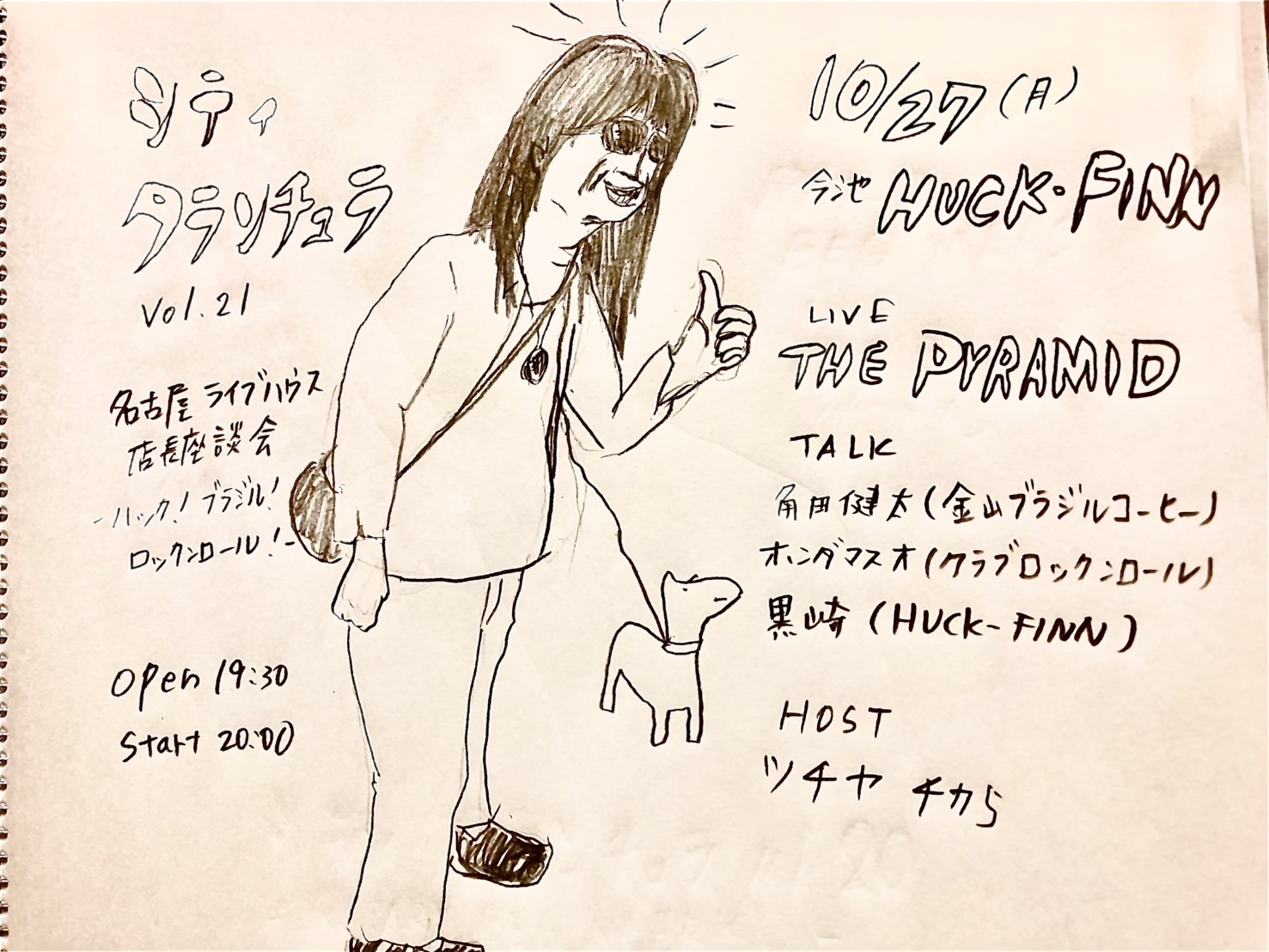![]() 10/27(MON) [シティ・タランチュラ vol.21] -名古屋ライブハウス店長座談会~ハック!ブラジル!ロックンロール!- LIVE:THE PYRAMID TALK: 角田健太 (金山ブラジルコーヒー) ホンダマスオ (クラブロックンロール) 黒崎 (HUCK FINN) HOST:ツチヤチカら |
