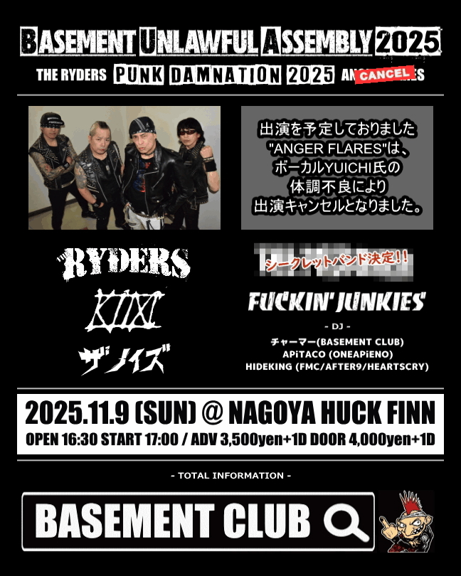 ![]() 11/9(SUN) [BASEMENT UNLAWFUL ASSEMBLY 2025 / PUNK DAMNATION 2025] THE RYDERS KiM FUCKIN' JUNKIES THE NOiSE and シークレットバンド --DJ-- チャーマー (BASEMENT CLUB) APiTACO (ONEAPiENO) HIDEKING (FMC/AFTER9/HEARTSCRY) ※出演を予定しておりました"ANGER FLARES"は、 ボーカルYUICHI氏の体調不良により出演キャンセルとなり、 代わりにシークレットバンドの出演が決定しました。 |