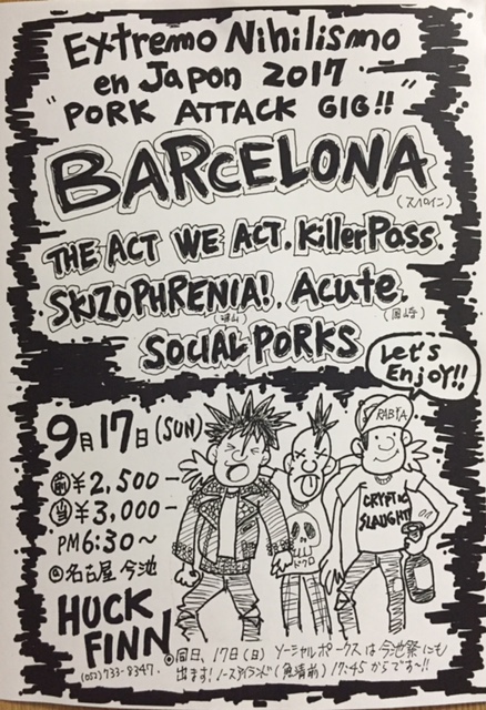 | 9/17(日) | [Barcelona Extremo Nihilismo en Japon 2017 NAGOYA!!] -PORK ATTACK GIG!!- BARCELONA (from Spain) THE ACT WE ACT Killerpass SKIZOPHRENIA! (津山) ACUTE SOCIAL PORKS 18:00 / 18:30 ¥2500 / ¥3000(DRINK別) |