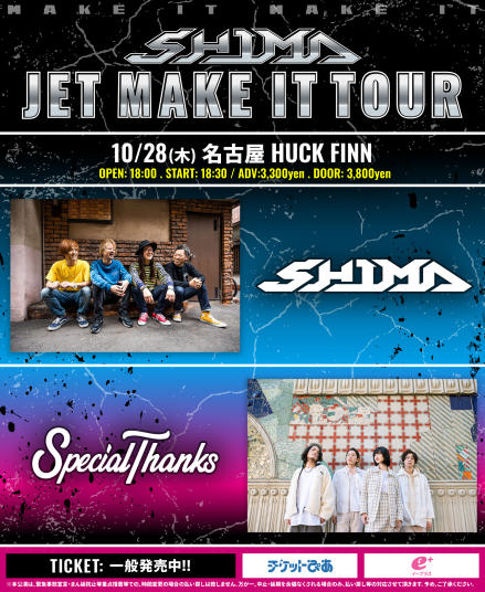 | 10/28(木) | [SHIMA 「JET MAKE IT TOUR」] SHIMA SpecialThanks 18:00 / 18:30 ¥3300 / 当日券未定 (DRINK別) |