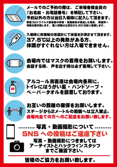 | 12/4(土) | DEMANDA ZILEMMA NITROX あくたむし 18:00 / 18:30 ¥ 2500 / ¥3000 (DRINK別) ■ご予約はハックフィンへメールにてご連絡頂きますと、 当日の記入が必要なくスムーズにご入場頂けます。 公演日・お名前フルネーム・お電話番号 上記3点の明記をお願い致します。 |