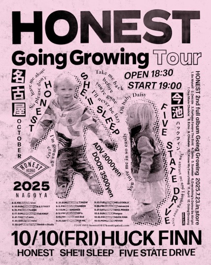 | 10/10(金) | [HONEST Going Growing Tour] HONEST SHE'll SLEEP FIVE STATE DRIVE 18:30 / 19:00 ¥3,000 / ¥3,500 (DRINK別) TICKET ▶ https://forms.gle/jZhdHfU5KYtg5qCN7 |