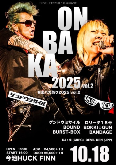 | 10/18(土) | [音楽バカ祭り 2025 Vol.2 ~ONBAKA・2025 Vol.2~] -DEVIL KEN生誕60周年記念祭- ゲンドウミサイル ロリータ18号 BOUND BOKKI☆GUN BURST−BOX BANDAGE --DJ-- 実(GRPC) DEVIL KEN(JPP) 15:30 / 16:00 ¥4,500 / ¥5,000 (DRINK別) ■前売チケット 予約:メール 前日締切 公演日・お名前フルネーム・お電話番号 上記3点の明記をお願い致します。 |