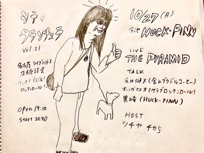 | 10/27(月) | [シティ・タランチュラ vol.21] -名古屋ライブハウス店長座談会 ~ハック!ブラジル!ロックンロール!- LIVE:THE PYRAMID TALK: 角田健太 (金山ブラジルコーヒー) ホンダマスオ (クラブロックンロール) 黒崎 (HUCK FINN) HOST:ツチヤチカら 19:30 / 20:00 当日券のみ ¥1,000 (1DRINK付) |