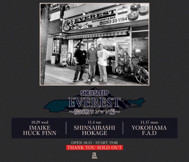 | 10/29(水) | [SHE'll SLEEP「EVEREST」] -接近戦ワンマン編- SHE'll SLEEP 18:15 / 19:00 ¥3,500 / |