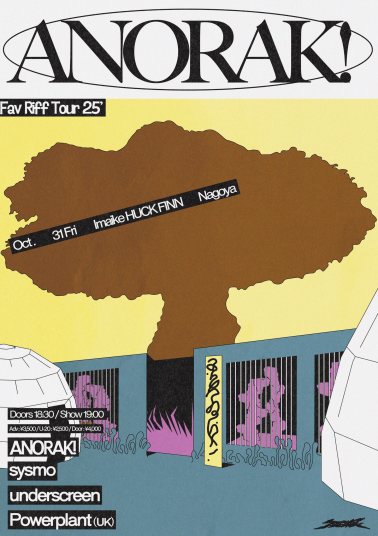 | 10/31(金) | [ANORAK! Fav Riff Tour '25] ANORAK! sysmo underscreen Poweplant (UK) 18:30 / 19:00 ¥3,500 / ¥4,000 (DRINK別) U20 ¥2,500 (DRINK別) |